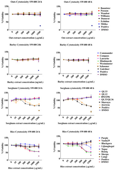 A time/dosage response assay was conducted to test cytotoxicity. Extracts were diluted to concentrations of 10, 100, 300, 500, 1000, 1500 µg/mL prior to testing. SW480 cells were cultured in 96 well plates at a cell density of 5 × 104 per well. After 24 h of incubation, cells were washed with PBS and incubated with the various extract preparations. An additional plate was also prepared as a blank (extracts with no cells) to compensate for extract colour. A negative control of plain media, positive control of 10 mM hydrogen peroxide and DMSO control of 3.7% (the maximum level present in reconstituted extracts) were also included. The experiment was replicated on FHC cells to test for cytotoxic effect of cereal extracts on normal cells. After 24 and 48 h treatments, 100 µL of resazurin dye was added. The dye was prepared according to Ataollahi, et al. [42] and Callcott, et al. [43]. After the reaction incubation period, absorbance was measured at 570 and 600 nm and calculated as described by Ataollahi, et al. as viability percentage [42]. All treatments were performed and measured three times (n = 3).