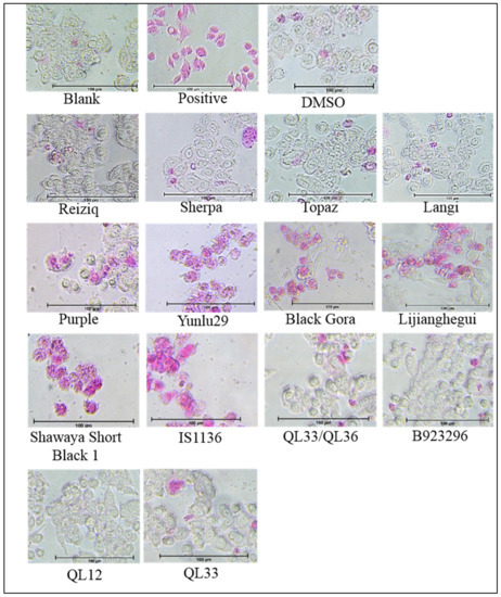 A morphological screening was preformed using the APOPercentage dye to identify if the cytotoxicity exhibited by selected cereal extracts was due to apoptosis. Sorghum varieties Shawaya short black 1 and IS11316, as well as the purple and red rice varieties, displayed pro-apoptotic effects with considerably high levels of dye retention, disruption of cell membrane integrity (Figure 2). Among the rice extracts Yunulu29 exhibited the highest level of pro-apoptotic activity, followed by Lijiangheui, Black Gora and Purple. Sorghum extracts, Shawaya short black and IS1136 were the most effective in inducing apoptosis. Similar to the cytotoxicity assay, no significant dye retention was observed in cells treated with extracts from non-pigmented rice, red and white sorghum varieties, barley or oat.