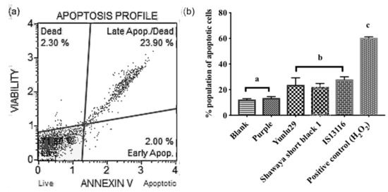 (a) Yunlu29 Muse plot of apoptosis induction (b) Proportion of pro-apoptotic activity using annexin assay in SW480 cells treated with rice and sorghum extracts. Bars with different letters represent significant difference in activity, results in (b) presented as mean ± standard deviation (n = 3).