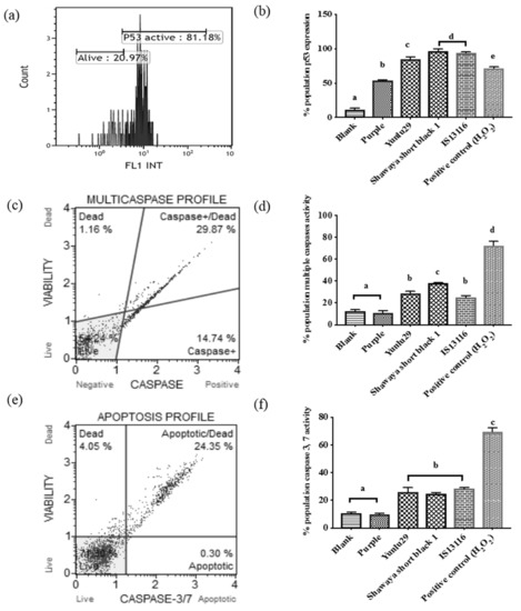 The MuseTM Multi caspase kit was used to measure the activity of caspases 1, 3, 4, 5, 6, 7, 8 and 9 by employing a VAD-peptide in combination with a cell viability dye (7-AAD). The membrane VAD-peptide is composed with a fluorescent group and an FMK moiety, FLICA (Fluorescent-labeled inhibitor of Caspase). This conformation allows the VAD-peptide to permeate cells and bind to active caspases, the resultant fluorescence is directly proportional to caspase activity. SW480 ells were cultured in 24 well plates at a concentration of 1 × 105 cell/mL in cell culture media as stated above. After 24 h of incubation, cells were washed with PBS and treated with the lowest cytotoxic concentration of 500 µg/mL phenolic extracts of Purple, Yunlu29, Shawaya short black 1 and IS11316. Afterwards, cells were washed, dislocated and resuspended in media containing 1% FBS at a concentration of 1 × 105 cell/mL. A 50 µL cell suspension was mixed with 5 µL of MuseTM Multi caspase working solution reagent, lightly vortexed and incubated for 30 min at 37 °C in a humidified atmosphere containing 5% (v/v) CO2. After incubation, 150 µL of 7-AAD dye working solution was added to the mixture and the mixture was incubated in the dark for 5 min. Following incubation, measurements were obtained using the Muse cell analyser and compared to a blank and a 10 mM H2O2 positive control. The measurement was recorded as population percentage of no caspase activity and live cells (live), caspase activity in live cells (caspase +), caspase activity in dead cells (caspase +/ dead), and death/ necrotic cells (dead). All treatments were performed three times.