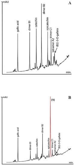 Figure 1A). Observing procyanidins higher than DP 4 was difficult, considering peak overlapping, a complex baseline, and their relatively low natural concentrations.