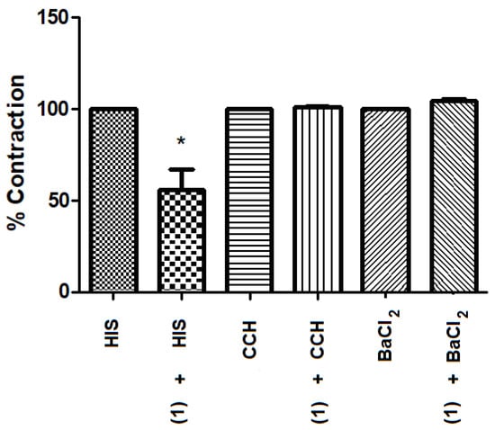 1 at a concentration of 10 µM. It is known that histamine-induced contraction of intestinal smooth muscle via stimulation of H1-receptors. The results may suggest an antihistamine effect of the tested compound. The presence of the test compound did not significantly alter the contractions of the small intestine after administration of carbachol or barium chloride (