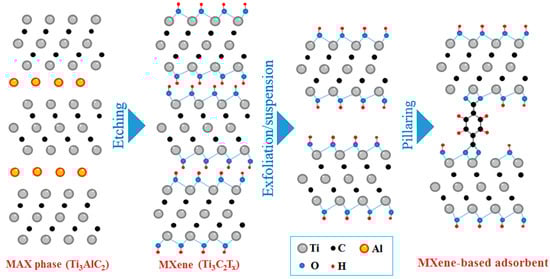 Scheme of MXene sheets preparation process from MAX phase and pillaring approach used in this study to synthetize the MXene-based adsorbent.