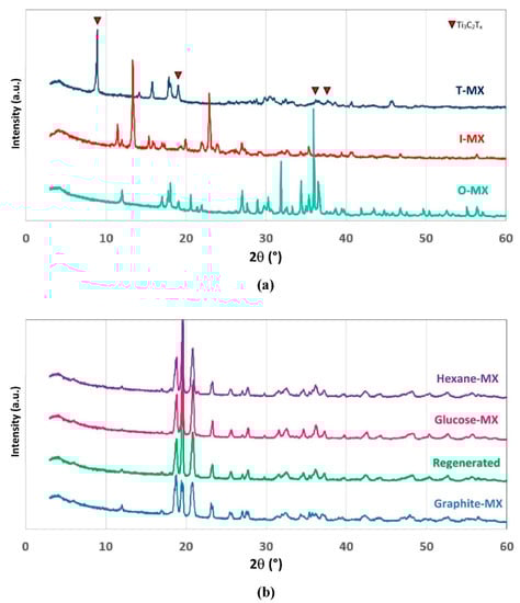 Supposedly, T-MX can be used to adsorb various organic cationic pollutants (e.g., other cationic dyes, some antibiotics, etc.). In order to assess the regenerability of the material with various organics, an experiment was carried out. The MAX phase was prepared with diverse carbon precursors (i.e., hexane and glucose) instead of graphite to demonstrate that diverse carbonaceous compounds can be viably incorporated in the carbide structure of the MAX phase. Once again, it was verified by XRD that MXene can be prepared from the so-synthetized MAX phases as well (Figure 4b). Such a result indicates that the carbon precursor is relatively unimportant for MC synthesis of MAX phase. Hence, theoretically any kind of organic pollutant can be carbonized and incorporated, allowing recycle of the spent adsorbent.
