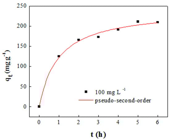 Adsorption kinetic of methylene blue onto T-MX (expressed as the adsorption capacity qt vs contact time t) and best-fitting by the pseudo-second-order model (10 mg T-MX, pH 7, 150 rpm, 20 °C).