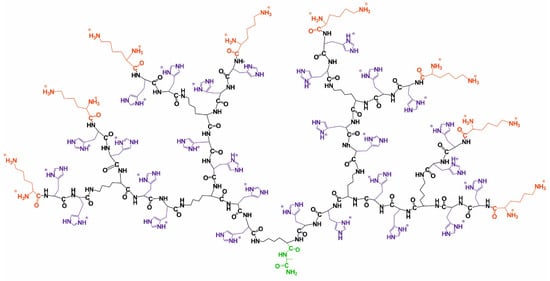 - Sheveleva, N.N.; Markelov, D.A.; Vovk, M.A.; Mikhailova, M.E.; Tarasenko, I.I.; Tolstoy, P.M.; Neelov, I.M.; Lahderanta, E. Lysine-based dendrimer with double arginine residues. RSC Adv. 2019, 9, 18018–18026. [Google Scholar] [CrossRef]