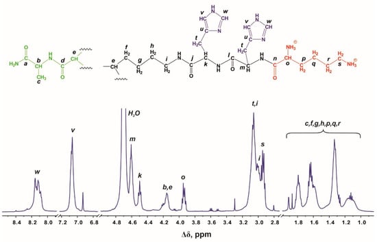 There are four regions in the 1H NMR spectrum (Figure 2) where peaks are observed: the first region at 8.35–6.90 ppm refers to the protons of imidazole rings in His residues; the second region from 4.55 to 3.85 ppm refers to protons in CH groups; the third region from 3.25 to 2.82 ppm is attributed to protons in CH2 groups that are adjacent to nitrogen atoms; and the fourth region at 1.95–1.00 ppm refers to methyl and methylene groups. The ratios of the integrated areas of each type of protons match the expected values (Table 1).