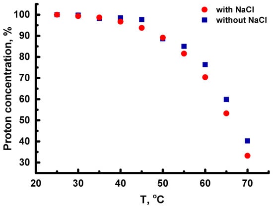 The temperature dependence of the concentration of protons at the C2 carbons of imidazole rings in His residues is presented in Figure 5. As seen in Figure 5, the proton concentration decreases up to 30% after increasing temperature from 25 to 70 °C. Therefore, the deuteration degree at the C2 position in the imidazole rings is around 70%. This result indicates that His residues in the inner segments are available to the water solvent. This fact is in agreement with the data of the atomistic modeling for the dendrimer that we carried out earlier []. We found that in the absence of NaCl in the solvent, the deuteration process has practically the same dependence, but the maximal value of the deuteration degree is smaller (~60%) than in the saline solution. We think that this result is caused by the presence of the salt ions in the solvent. Particularly, chlorine ions were used in histidine deuteration experiments [].