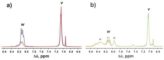 It is important to determine that deuterium labels will be stable during biological and medical studies. We have to make sure that the deuterated C2 carbons of the imidazole rings in histidine residues do not undergo the back-exchange reaction under physiological conditions. For this purpose, we removed D2O from the solution and redissolved Lys-2His dendrimer in H2O. The concentration of NaCl in the solution was kept the same. Heating at 40 °C over four hours did not change the integral value of the peak (w) at 8.12 ppm. It means that the deuteration degree remains constant under physiological conditions. The replacement of deuterons with protons was observed when the dendrimer solution was heated at 70 °C over four hours. Figure 6 illustrates the evolution of the peak (w) at 8.12 ppm during hydrogen–deuterium exchange (a) and deuterium-hydrogen exchange (b) reactions. As can be seen in Figure 6b, recovery of the integral value of the peak (w) has partially occurred. It should be noted that the additional peaks at 7.95 and 8.30 ppm (Figure 6b) are assigned to protons in the NH groups and appeared as a result of the reverse exchange in these groups in H2O.