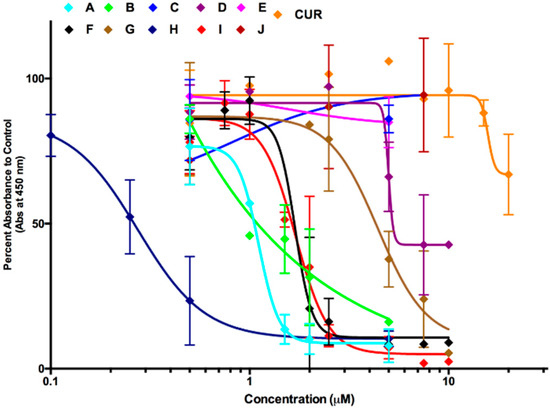 Figure 2. Effect of various curcumin analogs on cell viability of A375 melanoma cells. A375 melanoma cells were treated with natural curcumin (CUR) and curcumin analogs (A-J) for 48 h. The WST-1 assay was performed as described in the materials and methods section. Values are expressed as a mean ± SD from at least three independent experiments. The x-axis represents concentration (μM) and the y-axis represents absorbance (% of control). Graph obtained using the log (inhibitor) vs. response—variable slope (four parameters) curve on GraphPrism6.