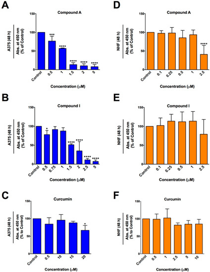 Figure 3. Compounds A and I selectively reduce cell viability in human melanoma cells. (A–C) A375 melanoma cells and (D–F) noncancerous normal human fibroblasts (NHF) were treated with Compound A, Compound I, and curcumin for 48 h. The WST-1 assay was performed as described in the materials and methods section. A375 cell viability data from Figure 1 were re-plotted as bar graphs to produce Figure 3 (A–C). Values are expressed as a mean ± SD from at least three independent experiments. The x-axis represents concentration (μM) and the y-axis represents absorbance (% of control).