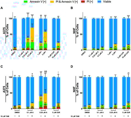 Figure 4. Compounds A and I induce apoptosis selectively and Compound A interacts positively with tamoxifen. (A) A375 melanoma cells and (B) noncancerous normal human fibroblasts (NHF) were treated with the indicated compounds for 48 h then stained with Annexin V and PI to quantify apoptosis, as described in the materials and methods section. Image based cytometry was utilized to assess apoptosis. The y-axis represents the percent of cells positive for Annexin V (green), PI (red), Annexin V and PI (orange), or cells negative for Annexin V and PI (blue). Values are expressed as mean ± SD from three independent experiments. (C) A375 melanoma cells and (D) NHF cells were treated with Compound A and curcumin alone and in combination with tamoxifen for 48 h. Please note, the data of Compound A and curcumin alone shown in Figure 4A,B were used again in Figure 4C,D, respectively along with the combination treatments for direct comparison. *p < 0.05 vs. DMSO control (comparison of viable cells only); **p < 0.01 vs. DMSO control (comparison of viable cells only); ***p < 0.001 vs. DMSO control (comparison of viable cells only); ****p < 0.0001 vs. DMSO control (comparison of viable cells only); #p < 0.05 vs. 0.1 μM Compound A alone (comparison of viable cells only); $p < 0.05 vs. 0.25 μM Compound A alone (comparison of viable cells only); ^p < 0.05 vs. 5 μM CUR alone (comparison of viable cells only); @p < 0.05 vs. tamoxifen treatment alone (comparison of viable cells only). (E) A375 micrographs at 48 h. Top: Bright field images at 400× magnification. Bottom: Fluorescent images stained with PI (red) and Hoechst (blue). Scale bar = 100 μm. Micrographs are representative of three independent experiments. A = Compound A, I = Compound I, CUR = Curcumin, TAM = Tamoxifen.