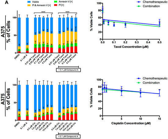 We investigated the effect of Compound A on the cell-death-inducing activity of taxol and cisplatin on human melanoma cells. A375 (Figure 5A) and G361 (Figure 5B) cells were treated with a range of taxol and cisplatin doses in the presence or absence of 0.1 μM Compound A. The Annexin V and propidium iodide staining revealed that there was no enhancement of cell death by the combination treatments in A375 cells. In G361 cells, an enhancement was observed when 0.01 μM of taxol was combined with 0.1 μM Compound A, relative to taxol alone. However, there seems to be no enhancement at higher doses of taxol in G361 cells. We did not observe any enhancement of cisplatin when combined with Compound A in G361 cells.