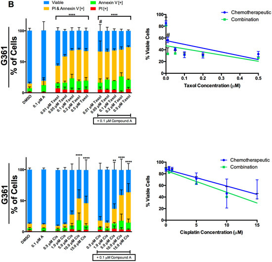 Figure 5. The interaction of Compound A with taxol and cisplatin in two melanoma cell lines. (A) A375 and (B) G361 melanoma cells were treated with a range of taxol (top panel) and cisplatin concentrations (bottom panel) alone and in combination with a sub lethal dose of Compound A (0.1 μM). Following 48 h of treatment the cells were stained with Annexin V and PI to distinguish early apoptosis and late stage apoptosis, respectively. Image based cytometry was utilized to assess apoptosis. The y-axis represents the percent of cells positive for Annexin V (green), PI (red), Annexin V and PI (yellow), or negative for both Annexin V and PI (blue). All graphical values are expressed as a mean ± SD from three independent experiments. A line graph was constructed using viability values for individual chemotherapeutics in the absence and presence of Compound A (combination). **p < 0.01 vs. DMSO control (comparison of viable cells only); ****p < 0.0001 vs. DMSO control (comparison of viable cells only); #p < 0.0001 vs. 0.01 μM taxol alone (comparison of viable cells only). Cis = Cisplatin.