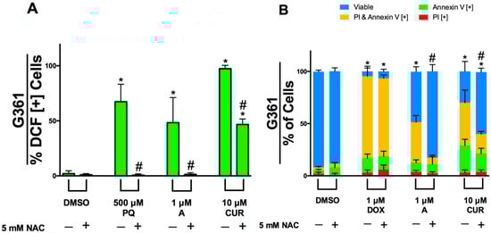 Figure 6. Induction of apoptosis by Compound A is dependent on the production of reactive oxygen species. (A) G361 cells were pre-treated with H2DCFDA and treated with Compound A and curcumin with or without the antioxidant N-Acetyl-L-cysteine (NAC) for 3 h, as described in the materials and methods section. Production of ROS was evaluated through image-based cytometry with the y-axis indicative of the percent of DCF positive cells. *p < 0.05 vs. DCF [+] cells of DMSO control; #p < 0.05 vs. DCF [+] cells of groups treated without NAC. (B) G361 cells were treated with the Compound A and curcumin with or without NAC for 48 h. Subsequently, cells were stained with Annexin V and PI, as described in the materials and methods. Image based cytometry was utilized to assess apoptosis. The y-axis represents the percent of cells positive for Annexin V (green), PI (red), Annexin V and PI (yellow), or negative for both Annexin V and PI (blue). All graphical values are expressed as a mean ± SD from three independent experiments. Doxorubicin (DOX) was used as a positive control. *p < 0.05 vs. DMSO control (comparison of viable cells only); #p < 0.05 vs. groups treated without NAC (comparison of viable cells only). PQ = Paraquat, A = Compound A, CUR = Curcumin.