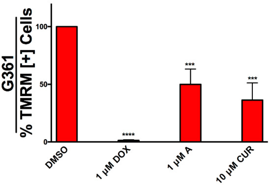 Tetramethylrhodamine methyl ester (TMRM; Thermo Fisher Scientific) stain was used to determine mitochondrial membrane potential (MMP) as outlined in a previously published protocol [24]. G361 cells were cultured and then treated with doxorubicin, Compound A, and curcumin for 48 h. Subsequently, the cells were incubated with 100 nM TMRM for 45 min at 37 °C. Cells were washed with PBS, and then a Tali Image-Based Cytometer (Life Technologies Inc., Cat. No. T10796, Burlington, ON, Canada) was then used to quantify the percentage of red stain from TMRM (stable mitochondrial membrane potential). Cells from 18 random fields were used to analyze the red (ex. 530 nm; em. 585 nm) channel.