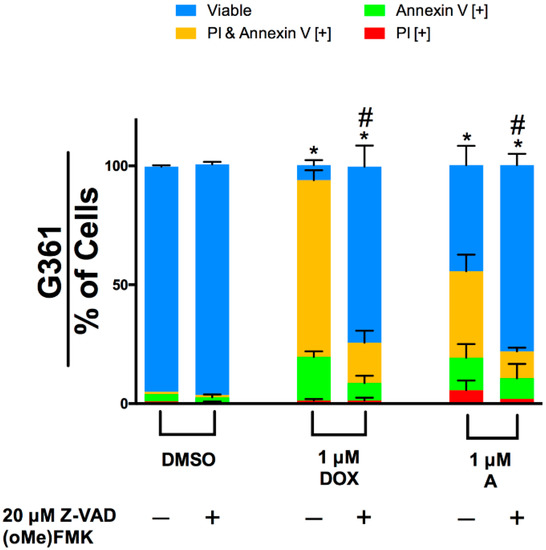 Figure 8. Induction of apoptosis by Compound A is caspase dependent. G361 melanoma cells were pre-treated with or without the caspase inhibitor Z-VAD-FMK for 30 min, followed by treatment with Compound A for 48 h. Cells were stained with Annexin V and propidium iodide to quantify apoptosis. Image based cytometry was utilized to assess apoptosis. The y-axis represents the percent of cells positive for Annexin V (green), PI (red), Annexin V and PI (orange), or cells negative for Annexin V and PI (blue). Values are expressed as mean ± SD from three independent experiments. *p < 0.05 vs. DMSO control (comparison of viable cells only); #p < 0.05 vs. individual chemotherapeutic treatment (comparison of viable cells only). Doxorubicin (DOX) was used as a positive control. A = Compound A, CUR = Curcumin.