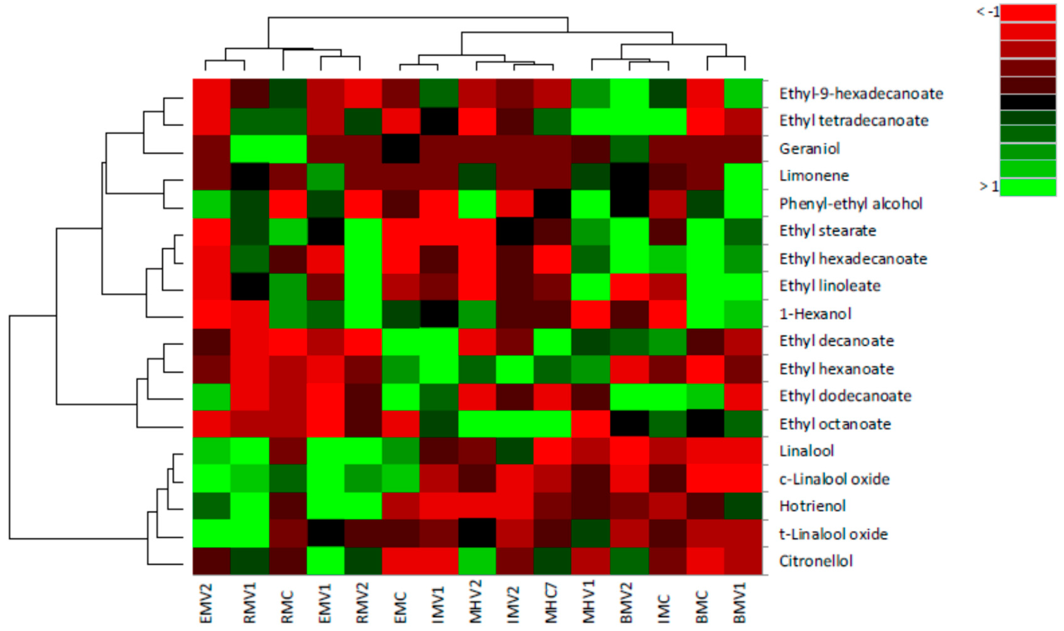- Garcia-Carpintero, E.G.; Sanchez-Palomo, E.; Gomez Gallego, M.A.; Gonzalez-Vinas, M.A. Effect of cofermentation of grape varieties on aroma profiles of La Mancha red wines. J. Food Sci. 2011, 76, C1169–C1180. [Google Scholar] [CrossRef]