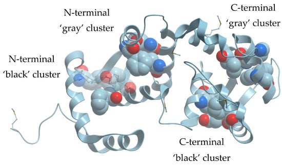 ‘Black’ and ‘gray’ clusters in the N- and C-terminal parts of human recoverin (Protein Data Bank (PDB) ID: 2D8N).