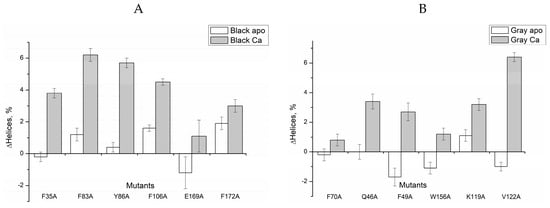 Effects of alanine substitutions in the ‘black’ (A) and ‘gray’ (B) clusters on α-helices content of recombinant wild type human recoverin in the absence of bound metal ions and in the presence of 1 mM CaCl2. Vertical bars show accuracy of α-helices content determination.