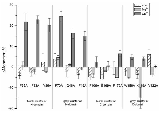 The data on secondary structure content estimated from the CD spectra are summarized in Table 1 and Figure 2. As can be seen, the most of the alanine substitutions in the ‘black’ clusters with the exception of E169A resulted in a slight increase in the α-helical content of apo-proteins (Figure 2A). In contrast, the mutations in the ‘gray’ clusters except for K119A caused a slight decrease in α-helical content in apo-proteins (Figure 2B). The changes did not exceed 2%, which is close to the accuracy of the α-helical content evaluation. Surprisingly, all the Ca2+-loaded mutants were characterized by an increase in the α-helical content, which in some cases exceeded 5% (Figure 2). The most pronounced increase in α-helical content was induced by mutations F83A, Y86A (N-terminal ‘black’ cluster) and V122A (C-terminal ‘gray’ cluster). Next, we studied effects of the mutations on multimerization/aggregation of recoverin by a chemical crosslinking method (Figure S2 and Table 2). Apo- and Mg2+-loaded forms of recombinant wild type (rWT) recoverin and all its mutants contained only monomers (60–70%) and dimers. Meanwhile, the binding of calcium to these proteins resulted in a decrease of the monomer content down to 15–40% and appearance of trimers and higher order multimers.