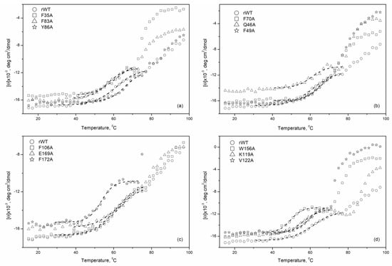 Temperature dependencies of molar ellipticity for apo-states of rWT human recoverin and its cluster mutants ((a)—‘black’ cluster of N-domain, (b)—‘gray’ cluster of N-domain, (c)—‘black’ cluster of C-domain, (d)—‘gray’ cluster of C-domain). 20 mM Tricin-KOH, pH 7.4, 50 mM KCl, 1 mM EDTA-KOH, 20 µM DTT. Protein concentration 3.3–3.7 μM. Theoretical curves computed according to a sigmoidal function and fitted to the experimental data are shown by dotted lines.