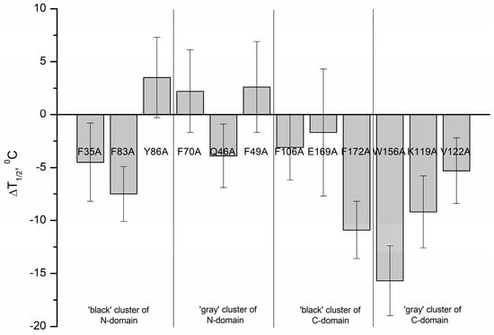 Table 3 and Figure 5 summarize the mid-temperatures of the thermal transitions of apo-states of rWT human recoverin and its cluster mutants. One can see that several mutations in the ‘black’ and ‘gray’ clusters of the C-terminal domain of recoverin caused a pronounced decrease in thermal stability of the protein. Thus, alanine substitutions of F172 (C-terminal ‘black’ cluster) as well as W156 and K119 (C-terminal ‘gray’ cluster) resulted in an 8–16 °C shift of the thermal transition to lower temperatures. The W156A mutant (C-terminal ‘gray’ cluster) was characterized by the lowest thermal stability (shift of the thermal transition to lower temperatures by 16 °C).