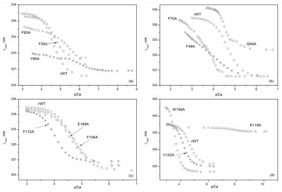 In the following step, we determined calcium affinities of rWT recoverin and its cluster mutants at 20 °C by means of spectrofluorometric Ca2+-titrations using the appropriate Ca2+-buffer solutions (Figure 6). The binding of calcium to rWT recoverin caused an increase in its tryptophan fluorescence intensity at 350 nm and a red shift of fluorescence spectrum maximum by 12 nm (Figure 6 and Figure 7). Generally, such Ca2+-induced effect depends on the quenching and relaxation properties of the environment of tryptophan chromophores in apo- and Ca2+-loaded forms of a protein (reviewed in []). In recoverin, this effect is explained by a transfer of buried tryptophan residues to the protein surface in contact with water molecules. Interestingly, the alanine substitutions in the ‘black’ cluster of the N-terminal domain of recoverin changed the sign of the Ca2+-induced effect: the binding of calcium to F35A, F83A, and Y86A mutants decreased the fluorescence intensity at 350/370 nm (Figure 6a). Similar effect was observed for F49A mutant containing substitution in‘gray’ cluster of the N-terminal domain (Figure 6b). In all other cases, the binding of calcium resulted in an increase in the fluorescence intensity at 320/350 nm (Figure 6c–e). The most complex effect was obsreved in the case of alanine substitution of K119 in the C-terminal domain as in this case the essential decrease in the amplitude of the Ca2+-induced fluorescence change was accompanied by its shift to significnatly lower calcium concentrations; i.e., by essential increase in calcium affinity.