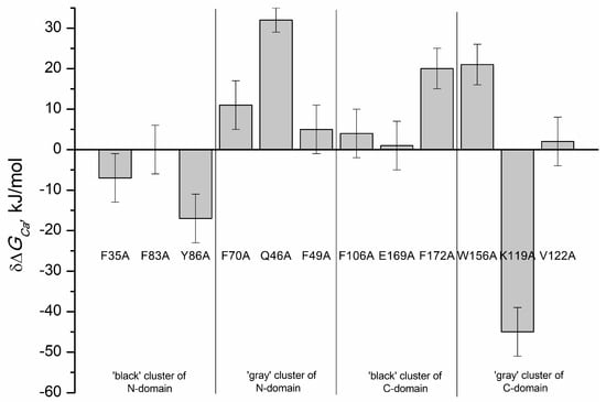 However, for some of the mutants, the data were fitted only to cooperative (F172A and W156A) or sequential (Y86A, F70A) binding models indicating that the introduction of these substitutions not only altered Ca2+-binding to individual EF-hands, but also affected interplay between these motifs. For instance, in the case of F70A mutant (substitution in the ‘gray’ cluster of the N-terminal domain) the filling of the first Ca2+-binding site caused a decrease in fluorescence intensity, whereas the filling of the second site resulted in an increase in fluorescence intensity (Figure 6e). In addition, the data for the mutant Q46A (‘gray’ cluster of the N-terminal domain) were best fitted only to the one-site binding scheme (Figure 6e), suggesting that this protein exhibited no ion coordination in one of the Ca2+-binding sites. Figure 8 and Table 4 show effects of cluster mutations on Ca2+-induced change in free energy of recoverin reflecting its affinity to the cation. Like in the case of thermal denaturation, the most pronounced changes were caused by the alanine substitutions of F172 (‘black’ cluster of the C-terminal domain), W156 and K119 (‘gray’ cluster of the C-terminal domain) as well as Q46 (‘gray’ cluster of the N-terminal domain). Yet, the effects of these mutations were differently directed: the mutant K119A demonstrated significantly improved calcium binding (three to four orders of magnitude), whereas F172A and W156A mutants were characterized by the 10-fold decrease in calcium affinity.