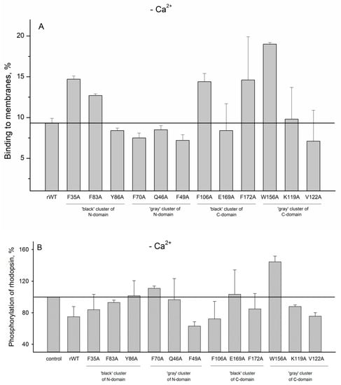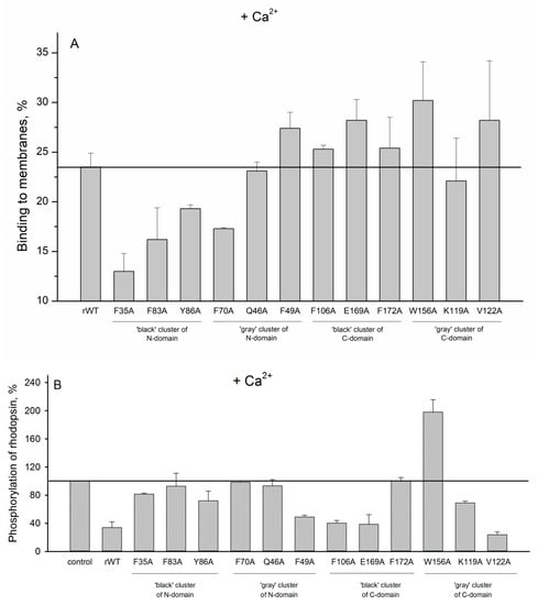 In order to evaluate impact of the cluster mutations on functional properties of recoverin, we next studied the interaction of recoverin and its mutants with photoreceptor membranes and examined effects of these proteins on phosphorylation of rhodopsin by GRK1 (rhodopsin kinase). It is known that Ca2+ binding to functional EF-hands of recoverin (EF-hand 2 and EF-hand 3 []) results in opening of hydrophobic pocket of the protein and a transfer of its initially buried myristoyl group to the solvent (Ca2+-myristoyl switch) []. The exposed residues of the hydrophobic pocket (F23, W31, F35, F49, I52, Y53, F56, Y86, and L90) form a binding site for N-terminal helix of GRK1 [], whereas myristoyl group mediate the interaction of the protein with photoreceptor membranes [,]. Our experiments revealed that the most of the N-terminal clusters mutations (except for F49A) suppressed membrane binding of Ca2+-loaded recoverin (Figure 9A) and its inhibitory activity towards GRK1 (Figure 9B). We suggest that these effects are connected to each other as the reduced membrane binding of recoverin might decrease its effective concentration in the proximity to GRK1/activated rhodopsin. In addition, the negative effect of the substitutions of F35, Y86 (N-terminal ‘black’ cluster), and F49 (N-terminal ‘gray’ cluster) on inhibitory activity of recoverin may be attributed to their participation in the hydrophobic pocket responsible for GRK1 binding []. In contrast to N-terminal mutations, the substitutions in C-terminal clusters generally did not affect membrane binding of recoverin (Figure 9A). Consistently, the majority of the mutants with the exception of F172A and W156A exhibit effective GRK1 inhibition (Figure 9B). Surprisingly, the mutant W156A aberrantly activated rhodopsin phosphorylation regardless of the presence of calcium (Figure 9B and Figure 10B). The origin of this effect remains puzzling, although it can be associated with increased membrane binding of both Ca2+-free and Ca2+-bound forms of the protein and/or promoting formation of a complex between GRK1 and bleached rhodopsin.