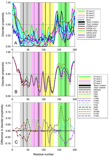 Figure 11B shows the effect of the cluster mutations (F35A, F83A, and Y86A in the N-terminal ‘black’ cluster, F70A, Q46A, and F49A in the N-terminal ‘gray’ cluster, F106A, E169A, and F172A in the C-terminal ‘black’ cluster, and W156A, K119A, and V122A in the C-terminal ‘gray’ cluster) on the local intrinsic disorder propensity of human recoverin evaluated using the PONDR® VSL2 algorithm. To better visualize the mutation-induced alterations in the local intrinsic disorder propensity, Figure 11C shows “difference disorder spectra” calculated by the subtracting the PONDR® VSL2 disorder profile of the wild type human recoverin from the disorder profiles of each of it cluster mutants. Here, positive and negative values correspond to the mutations that induce increase and decrease in local disorder predisposition, respectively. Figure 11C illustrates that 9 of 12 cluster mutations were predicted to cause increase in the local intrinsic disorder propensity. The exceptions are given by Q46A mutation in the N-terminal ‘gray’ cluster, K119A mutation in the C-terminal ‘gray’ cluster, and E169A mutation in the C-terminal ‘black’ cluster. These results were rather expected since these three mutations (Q46A, K119A, and E169A) resulted in changes of more disorder-promoting residues Q, K, and E to a disorder-neutral alanine, whereas in all other cases, alanine substitutes residues with high order-promoting potential (F, Y, W, and V).