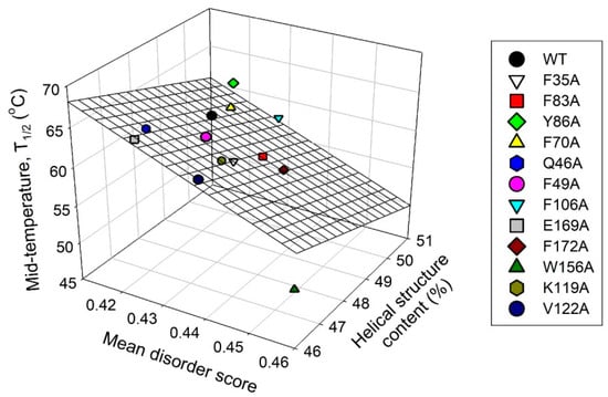 Correlation between the protein-average disorder propensity, helical propensity, and thermal stability of human recoverin and its cluster mutants.