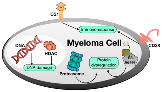 - Proteasome inhibitors [8]. The proteasome is a multicatalytic target responsible for the degradation of 80–90% of proteins during cell life. Until now, three proteasome inhibitors have been approved for clinical use: Bortezomib, Carfilzomib, and Ixazomib. Particularly, Bortezomib was the first FDA-approved proteasome inhibitor and represents one of the most important discoveries for fighting MM of recent years. Of note, these agents can stimulate bone formation in MM patients [9]. Proteasome modulation can be also achieved by employing small molecules such as lenalidomide, structurally related to thalidomide and acting as E3-Ligasi inhibitors [10].