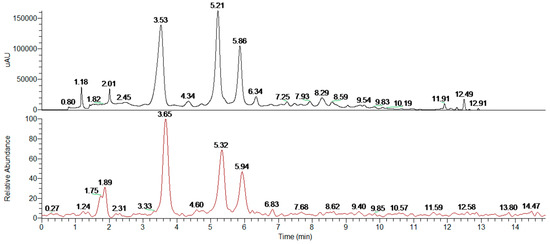 HPLC-UV/PAD-ESI/MS profile recorded at λ = 325 nm (black line) and reconstructed ion chromatograms (red line) of H. sabdariffa ethanolic extract (HsEE).