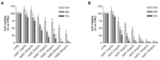 RPMI 8226 cell viability after HsEE or HsFC treatment. (A) MTT assay of RPMI 8226 cells treated with different concentrations (1–50 mg/mL) of HsEE for 24, 48, and 72 h. (B) MTT assay of RPMI 8226 cells treated with different concentrations (1–10 mg/mL) of HsFC for 24, 48, and 72 h. Untreated cells (CTRL) are control. Graphs represent the mean percentage ± SD of viable cells of three independent experiments (* p < 0.05, ** p < 0.01 vs. CTRL).