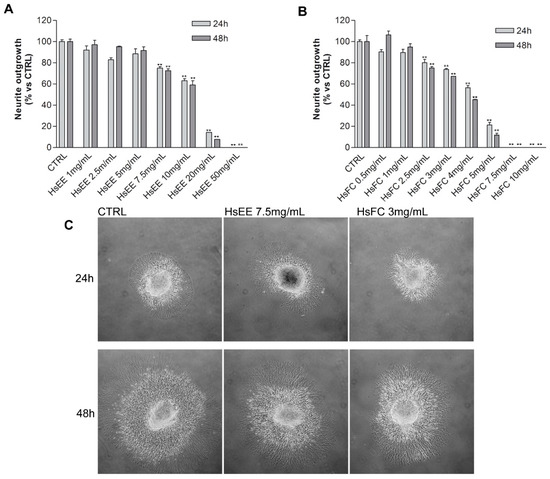 In vitro DRG neurotoxicity of HsEE and HsFC. (A) Neurite outgrowth from DRG treated with HsEE for 24 and 48 h. (B) Neurite outgrowth from DRG treated with HsFC for 24 and 48 h. Graphs represent mean neurite length ± SD of three independent experiments. (** p < 0.01 vs. CTRL). (C) Representative images of DRG treated with HsEE or HsFC for 24 and 48 h. Untreated DRG represent the controls.