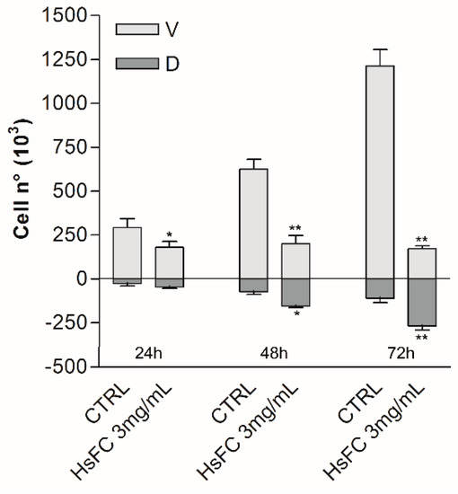 Trypan blue vital count assay of RPMI 8226 cells treated with HsFC 3 mg/mL. Untreated cells (CTRL) are control. Graphs represent the mean ± SD number of counted viable (V) and dead (D) cells of three independent experiments. (** p < 0.01 vs. CTRL).