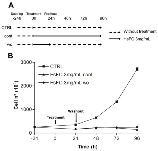 Effect of RPMI 8226 cells treated with HsFC 3 mg/mL in continuous (cont) or in washout (wo) culture medium. (A) Time schedule of HsFC treatment. Black arrows represent the presence of HsFC in culture medium of cont or wo treatment. Dashed lines represent culture medium without treatment. (B) Graphs represent the mean ± SD number of viable cells counted in three independent experiments.