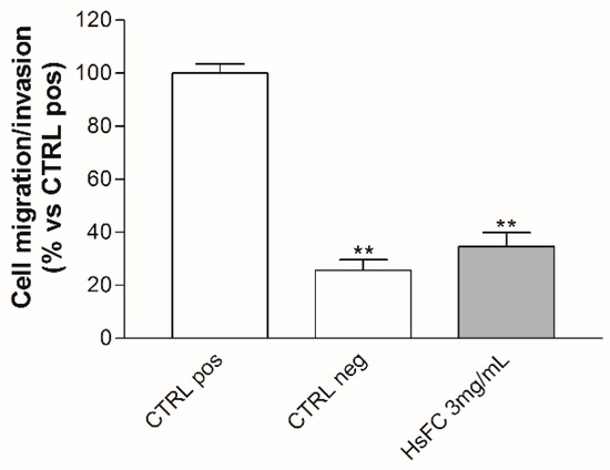 RPMI 8226 cell migration/invasion after HsFC treatment. The migration/invasion ability of RPMI 8226 cells was assessed by Boyden chamber assay. Cells were treated with HsFC 3 mg/mL. Untreated cells with or without FBS as chemoattractant represent positive controls (CTRL pos) and negative controls (CTRL neg), respectively. Data represent the percentage of migrating cells with respect to CTRL pos, arbitrarily set to 100%, and are expressed as mean ± SD of three independent experiments. (** p < 0.01 vs. CTRL pos).
