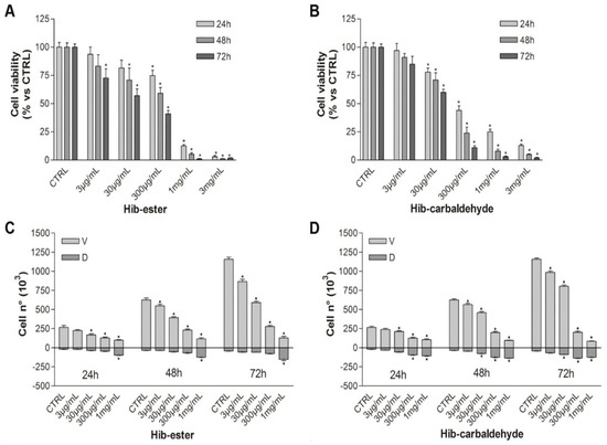 Both compounds significantly reduced cell viability of RPMI 8226 cells (MTT test) in a dose- and time-dependent manner (Figure 9A,B). After 24 h of treatment, Hib-ester and Hib-carbaldehyde are about ten and 20 times more active than HsFC, showing IC50 values of 0.45 and 0.21 mg/mL, respectively. Results of the trypan blue vital count assay highlighted a similar trend (Figure 9C,D).