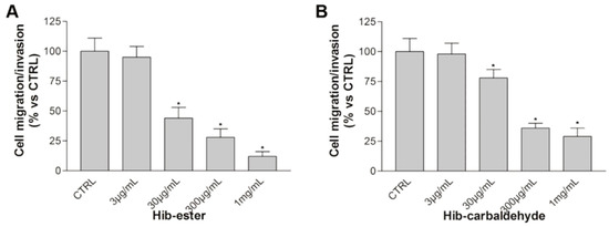 Regarding the ability to impair cell migration and invasion, both compounds are effective at their respective IC50 values. Particularly, Hib-ester inhibits cell migration and invasion by more than 50% at 30 µg/mL (Figure 10A,B).