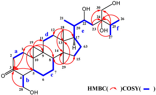 The molecular formula of maryloside A (1) was determined to be C36H60O10 from the molecular ion peak [M + Na]+ at m/z 675.4082 (calculated for m/z 675.4084) in the positive-ion HR-FAB-MS with 7 degrees of unsaturation. The IR spectrum showed the presence of carbonyl group (1705 cm−1) and hydroxyl group (3271 cm−1). The 1H-NMR and 13C-NMR spectra of 1 suggested the presence of sugar moiety in the molecule (Table 1 and Table 2). The hydrolysis of 1 by cellulase liberated an aglycone of 1 (1a). The 1H-NMR spectrum of 1a indicated characteristic signals of cyclopropane ring at δH 0.33 (doublet, d, J = 4.1 Hz) and 0.56 (d, J = 4.1 Hz), the presence of two methyl groups—signals at δH 0.86 (singlet, s) and 1.04 (s), three methyl groups at δH 1.21 (d, J = 6.0 Hz), 1.22 (d, J = 7.0 Hz) and 1.25 (d, J = 7.0 Hz), two oxygen-bearing methylene protons at δH 3.96 (d, J = 11.0 Hz) and 4.39 (d, J = 11.0 Hz), 4.05 (d, J = 11.9 Hz), 4.06 (d, J = 11.9 Hz) and one oxygen-bearing methine proton at δH 4.61 (d, J = 9.9 Hz) (Table 3). All thirty carbons in 13C-NMR spectrum of 1a were clearly assigned on the basis of H-H COSY, HMQC and HMBC experiments. The 13C-NMR spectrum of 1a showed the presence of a carbonyl group at δC 211.9, a tertiary alcohol at δC 76.1, a secondary alcohol at δC 69.3 and two primary alcohols at δC 57.7 and 66.8 (Table 2). The H-H COSY and HMQC spectra showed that 1a had partial structures (a–f) –CH2–CH2– (a; C-1 and C-2), –CH–CH2– (b; C-4 and C-28), –CH–CH2–CH2–CH– (c; from C-5 to C-8), –CH2–CH2– (d; C-11 and C-12), –CH2–CH2–CH–CH(CH3)–CH–CH2– (e; from C-15 to C-23) and CH3–CH–CH3 (f; from C-26 to C-25 and from C-25 to C-27) (Figure 1). The HMBC spectrum showed correlations from H-1, H-2, H-5 and H-28 to C-3, and from H-19 to C-1, C-5, C-8, C-9, C-10 and C-11. These correlations established the connection between the partial structures a and d. Furthermore, the HMBC spectrum exhibited cross-peaks from H-18 to C-12, C-13, C-14 and C-17, and from H-29 to C-8, C-13, C-14 and C-15, which connected among partial structures c, d and e. In the HMBC spectrum, there were cross-peaks appearing from H-23 to C-24 and C-30, from H-25 to C-24 and C-30, and from H-26 and H-27 to C-24. Finally, all partial structures of a–f were connected. The relative configuration of 1a was determined by the NOESY experiment, coupling constant and X-ray crystallographic analysis. The NOESY spectrum between H-4β-axial and H-19, between H-8β-axial [δH 1.58 (dd, J = 4.9, 12.6 Hz)] and H-18, and between H-8β-axial and H-19 confirmed to be β-axial oriented protons at C-4, C-8 C-18 and C-19. On the other hand, the NOESY spectrum between H-1α-axial and H-5α-axial, between H-6α-equatorial and H-28, between H-7α-axial and H-29, between H-12α-axial and H-29, and between H-17α-axial and H-29 confirmed to be α-axial-oriented protons at C-5, C-17 and C-29 positions. The configuration at C-20 position of 1a was suggested as S* configuration according to NOE correlations between H-12β -equatorial and H-21, and between H-18 and H-20. Finally, 20S*, 22R* and 24R* were confirmed by X-ray crystallographic analysis (Figure 2).