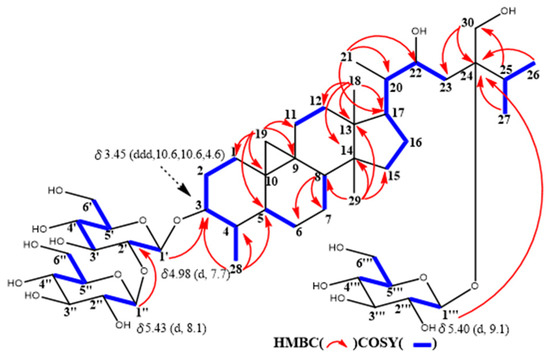 The molecular formula of maryloside D (4), C42H70O15, was determined by HR-FAB-MS m/z 837.4648 [M + Na]+ and 13C-NMR data. The IR spectrum showed the presence of carbonyl group (1686 cm−1) and hydroxyl group (3393 cm−1). Detailed examination of 1D and 2D NMR spectra of 4 and comparison with those of 1 showed that the chemical shift values of 4 were very similar with those reported for 1, except for the additional extra sugar moiety linked to C-30 that was confirmed by the HMBC correlation from the anomeric proton H-1‴ at δH 5.00 (d, J = 7.8 Hz) to C-30 (Table 1 and Table 2). Thus, the structure of maryloside D (4) was established as 24-methyl-30-norcycloart-22R*, 24R*, 28, 30-tetraol-3-one-28-O-β-D-glucopyranosyl-30-O-β-D-glucopyranoside (Figure 4).