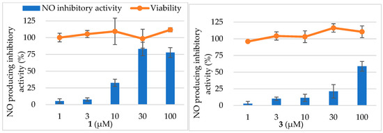 Nitric oxide (NO) production inhibitory activities and cell viability of 1 and 3.