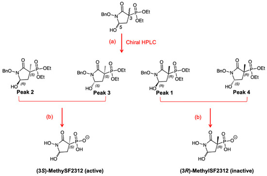 Figure 2. In racemic, protected MethylSF2312, C-3 is blocked and cannot epimerize. After separation by chiral HPLC, four enantiomers were separated. C-5 epimerizes during the deprotection reactions, affording chirally active (3S)- and (3R)-MethylSF2312 as diastereomeric mixtures. Reagents and conditions: (a) Lux Cell-1 21.2 × 150 mm (Phenomenex, Torrence, CA, USA) column. (b) 1. TMSI, DCM, rt, overnight (40%); 2. Pd(OH)2, water, 4 h, rt (75%).