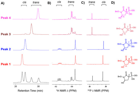 Figure 4. Chiral separation of MethylSF2312 precursor into four enantiopure fractions. (A) Chromatogram of fully protected MethylSF2312 (Intermediate 6, diethyl (1-(benzyloxy)-5-hydroxy-3-methyl-2-oxopyrrolidin-3-yl)phosphonate), consisting of a racemic mixture of cis/trans isomers in a ~2:1 ratio (black trace, x-axis shows retention time and y-axis absorption at 254 nm). Enantiomeric purity was verified by re-running each fraction on the same column (red, blue, brown, pink traces. Peak 1 (P1, rt = 23 min) showed 99.9% enantiomeric purity, peak 2 (P2, rt = 24.2 min) 96%, peak 3 (P3, rt = 27.1 min) 95% and peak 4 (P4, rt = 30.2 min) 97%. These were assigned to the cis and trans isomers based on Nuclear Magnetic Resonance (NMR). (B) Benzylic and 5-H protons; (C) 31P peaks; cis/trans isomers of intermediate 6 were assigned by NOESY with reference to [5]. (D) Structures of the chiral fractions. Structure of fraction 2 was assigned the S configuration based on the X-ray structure and the configuration of the other stereocenters was deduced thereafter from the cis/trans isomers (see results).