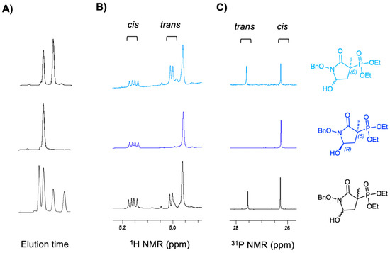Figure 5. Epimerization of MethylSF2312 precursor 6 in alkaline media. (A) Chromatograms, (B) 1H NMR spectra of benzylic and hemiaminal protons of (x-axis ppm), and (C) 31P (proton decoupled) spectra of the same preparations, with chiral structural assignments based on the X-ray structure of the final product. Bottom panel: racemic compound 6; Middle panel: enantiopure (3S,5R)-6; top panel: (3S,5SR)-6, obtained after treatment of (3S,5R)-6 with sodium bicarbonate.