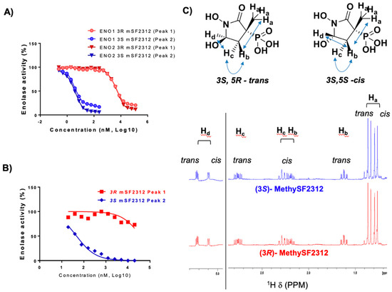 Figure 6. Dramatic difference in Enolase inhibitory potency between MethySF2312 generated from different chiral fractions. Enantiopure fractions were taken through deprotection reactions to remove the ethyl ester and benzyl protecting groups and subsequently tested for Enolase inhibitory activity. (A) Enolase activity in lysates from ENO1 (circles) and ENO2 (diamonds) D423 cells as a function of inhibitor concentration. (3S)-MethylSF2312 in blue and light blue; (3R)-MethylSF2312 in red and light red). (B) Enolase activity in lysates of E. coli. (3S)-MethylSF2312 in blue and (3R)-MethylSF2312 in red. (C) 1H NMR spectra of (3R)- and (3S)-MethylSF2312 in D2O, with proton assignments. The structure of cis/trans isomers and NOESY interactions are shown.
