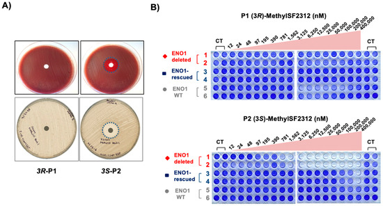 Figure 7. Biological activity correlates with Enolase inhibitory activity of MethylSF2312 chiral fractions. (A) Each disc was imbued with 35 μg of either (3S)- or (3R)-MethylSF2312 and incubated overnight at 37 °C on a lawn of E. coli in Columbia blood agar (top) or Muller Hinton agar (bottom) with G6P. Zones of clearing are shown by dashed blue circles. (B) D423 ENO1 deleted (red), D423 isogenic rescued (blue) and LN319 ENO1-WT (grey) were treated with (3R)- or (3S)-MethylSF2312 for 7 days, and cell density quantified by crystal violet.