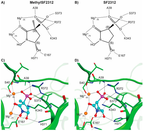 Figure 8. Racemic MethylSF2312 and SF2312 bind ENO2 in the 3S,5S configuration. A schematic depiction (A,B) and a three dimensional view (C,D) of the ENO2:MethylSF2312 structure (PDB: 5EU9, (A,C)) and ENO2:SF2312 (PDB: 4ZCW, (B,D)) showing the direct interaction with the ENO2 protein and the Magnesium ions in the active site. The hydrogen bonds, metal coordination bonds and salt bridge interactions are indicated by dashed lines. The two magnesium ions and water molecules in the active site pocket are represented by orange and red spheres, respectively. Although both ENO2 crystals were soaked with racemic SF2312 and MethylSF2312, in each case, only the (3S,5S)-enantiomer could be fitted to the electron density map. All major H-bonds and backbone interactions are essentially the same for SF2312 and MethylSF2312.